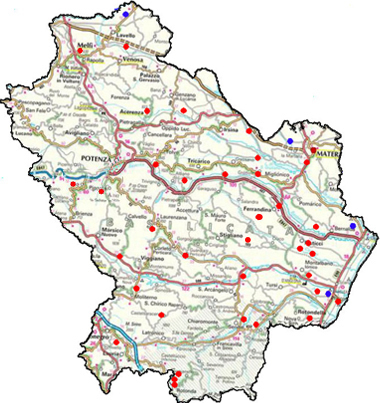 MELFI (PZ)  slm 560, 40° 59' 16'' N, 15° 39' 37'' E. LAVELLO (PZ) A.A.S.D. GAUDIANO 145 m slm 41° 06’ N 15° 51’ E VENOSA (PZ) PIAN DI CAMERA 412 m slm 41° 06’ N 15° 51’ E NOVA SIRI (MT) C.DA PIETRA DEL CONTE 150 m slm 40° 09’ N 16° 35’ E POLICORO (MT) PANTANO SOTTANO 10 m slm 40° 12’ N 16° 42’ E POLICORO (MT) C.DA TROYLI 138 m slm 40° 14’ N 16° 37’ E TURSI (MT) MARONE 40 m slm 40° 26’ N 16° 37’ E PISTICCI (MT) C.DA PAOLONE 46 m slm 40° 23’ N 16° 35’ E MONTALBANO J. (MT) COZZO DEL FICO 153 m slm 40° 17’ N 16° 35’ E METAPONTO (MT) PANTANELLO 10 m slm 40° 23’ N 16° 47’ E MONTESCAGLIOSO (MT) C.DA MENZANE 30 m slm 40° 29’ N 16° 43’ E MATERA C.DA MATINELLE 237 m slm 40° 42’ N 16° 31’ E CRACO PESCHIERA (MT) -  51 m slm 40° 21' N 16° 32' E BRINDISI DI MONTAGNA (PZ) SERRA DEL PONTE 656 m slm 40° 38’ N 15° 58’ E CAMPOMAGGIORE (PZ) C.DA MONTECRISPO 803 m slm 40° 35’ N 16° 05’ E S. GIORGIO L. (MT) PIANO DELLE ROSE 456 m slm 40° 08’ N 16° 22’ E SENISE (PZ) PIANO DELLE MANICHE 280 m slm 40° 09’ N 16° 19’ E ROTONDA (PZ) LORI 560 m slm 39° 57’ N 16° 02’ E ROTONDA (PZ) PIANO INCORONATA 450 m slm 39° 58’ N 16° 02’ E VIGGIANELLO (PZ) C.DA PEZZO LA CORTE 550 m slm 39° 59’ N 16° 03’ E NEMOLI (PZ) C.DA VENTRONA 450 m slm 40° 05’ N 15° 48’ E LAURENZANA (PZ) C.DA MARETTA 900 m slm 40° 26’ N 15° 57’ E GUARDIA PERTICARA (PZ) C.DA LUPARA 543 m slm 40° 21’ N 16° 05’ E VILLA D’AGRI (PZ) AZ. BOSCO GALDO 592 m slm 40° 21’ N 16° 49’ E SARCONI (PZ) C.DA TRUTOLO 630 m slm 40° 15’ N 15° 53’ E CASTELSARACENO (PZ) C.DA PIAN DELL’ERBA 850 m slm 40° 10’ N 15° 59’ E IRSINA (MT) S. MARIA D’IRSI 166 m slm 40° 44’ N 16° 21’ E ACERENZA (PZ) Località VILLAGGIO TABOR  altitudine m.850 slm Coordinate 40° 48’ N - 16° 56’ E GENZANO DI L. (PZ) C.DA RIPA D’API 300 m slm 40° 48’ N 16° 05’ E ALIANO (MT) AZ. BADERTA DELLE M. 250 m slm 40° 17’ N 16° 19’ E SATRIANO DI LUCANIA (PZ) C.da S. LUCIA 725 m slm 40° 34' N 15° 38’ E PANTANO di PIGNOLA (PZ) 40° 33' 26.2'' N, 15° 45' 28.6'' E GRASSANO (MT) GRASSANO SC. 198 m slm 40° 36’ N 16° 15’ E GROTTOLE (MT) C.DA SERRE 539 m slm 40° 36’ N 16° 23’ E FERRANDINA (MT) C.DA FOLLIA 350 m slm 40° 30’ N 16° 28’ E BERNALDA (MT) C.DA PEZZAGRANDE 38 m slm 40° 26’ N 16° 46’ E S.MAURO F. (MT) C.DA S. CHIARA 240 m slm 40° 28’ N 16° 23’ E PISTICCI (MT) CASTELLUCCIO 58 m slm 40° 21’ N 16° 36’ E STIGLIANO (MT) C.DA TORRE, 288 m slm 40° 23' N 16° 20' E GROTTOLE (MT) C.DA CASTELLANA 143 m slm 40° 39’ N 16° 23’ E MATERA DUE GRAVINE 162 m slm 40° 38’ N 16° 35’ E
