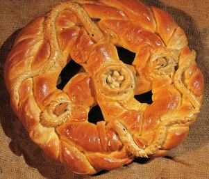 Pane ricamato e guarnito con uccelli, serpenti e nido. Prodotto molto antico risale al 1500 con la migrazione degli albanesi. Usato soprattutto nei matrimoni di origine albanesi e durante la Pasqua. La sua simbologia vuole significare:uccelli = la famiglia vecchia e nuova che si va a formare; nido = la casa dei futuri sposi; serpenti = le varie tentazioni della vita e la fecondità.