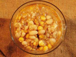 E' un piatto tipico della cultura contadina a base di fagiolo bianco, mais, cereali (grano tenero), olio di oliva, pancetta, aglio o cipolla e peperone macinato. E' un primo piatto che secondo la tradizione, veniva preparato  la vigilia di Capodanno e si condiva il giorno successivo per essere consumato come segno di buon auspicio e prosperità per tutte le famiglie.